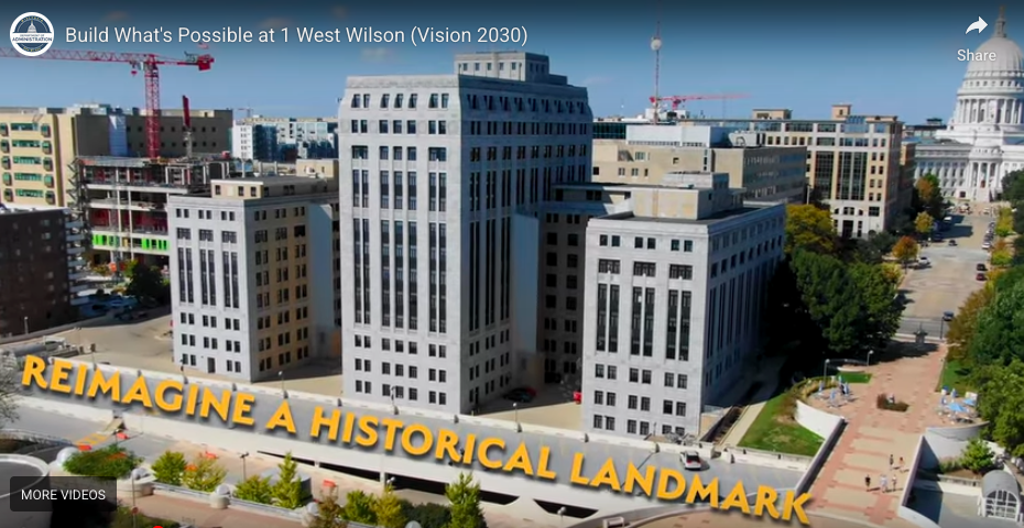 The old State Office Building at I West Wilson Street is for sale. The state Department of Administration announced the sale in early December and will accept bids until mid-March. “The sale is a part of a larger plan to reduce the state’s physical footprint in Downtown Madison,” the Wisconsin State Journal reported, “as more employees are working remotely after the COVID-19 pandemic reshaped the office environment.” [a]