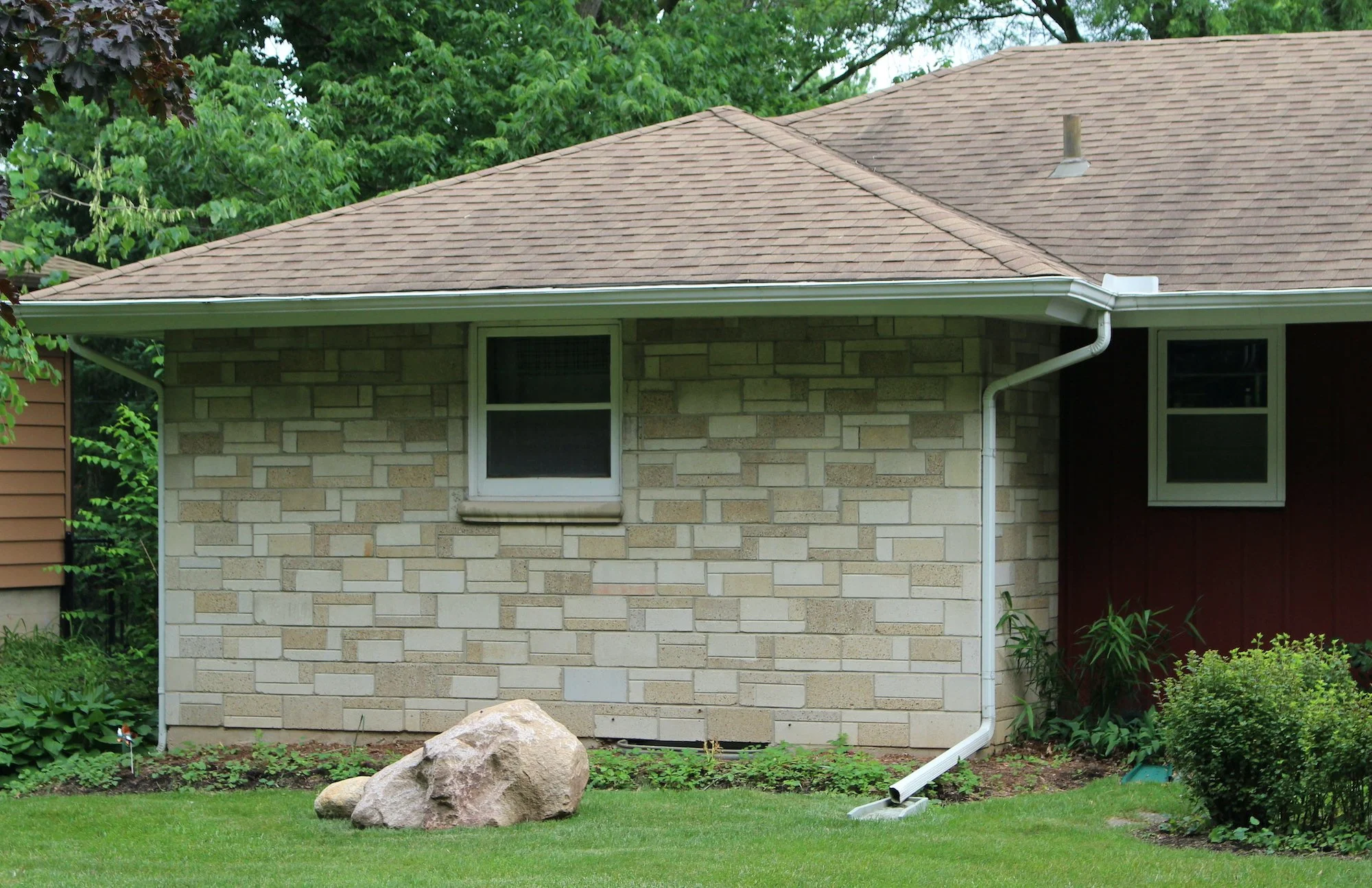 At first look, the distinctive facade on a Ranch house at 5102 Tomahawk Trail (1950) looks like it may be stone veneer, a decorative surface over a load-bearing wood frame. On closer examination,the CMUs have the same dimensions as eight-inch full blocks and likely provide the structural support for the perimeter walls. The aggregate mimics granite with flecks of white, red, and black; the narrow ends of corner blocks are whiter to make a quoining effect. The blocks were manufactured with false mortar lines to look like patterned ashlar. According to the current owners, a previous occupant applied red paint to the grooves that subdivide individual blocks. A nearby house at 5013 Risser Rd. (1954) has similar concrete blocks with unpainted grooves. [d]