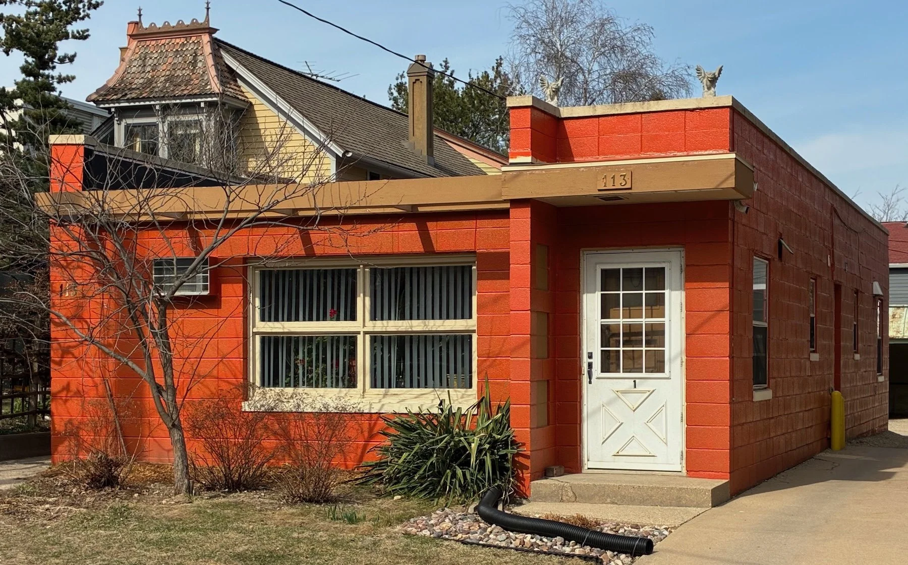 A two-unit apartment building at 113 S. Hancock St. (1955) makes a Contemporary statement on a constrained site in the First Settlement neighborhood. (Note the tiny Mansard roof on the house next door.) Straight lines in concrete and wood are enhanced by the crisp mortar joints between the stacked concrete blocks. This modest building is not shy with its bright coat of orange, a nod to its mid-century birthdate.