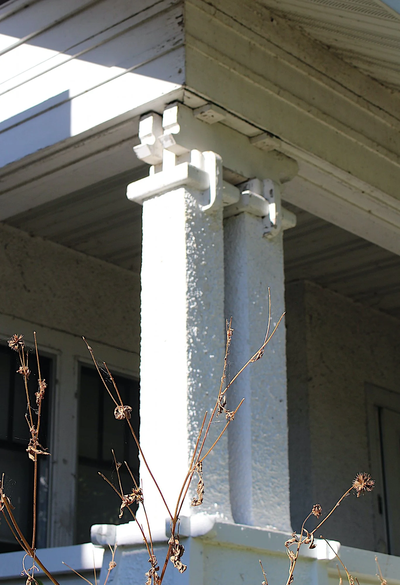 A second grouping in the Tenney-Lapham neighborhood was developed by Frank Hall, who was Tuttle’s distant relative in addition to being her employer. The A.M. and Zell Pardee House (1912) at 841 Prospect Place is the most visible of the houses and the clearest expression of the Craftsman style with stucco cladding, rafter tails, generous screened porch, and long shed dormer. Tucked behind it is a nascent bungalow court, a planning concept that also blossomed in California. Three bungalows on Russell Walk are tightly spaced, with Craftsman touches found in details such as the porch posts at 814 Russell Walk (1911-1914), which are topped by elaborate, Asian-influenced joinery.