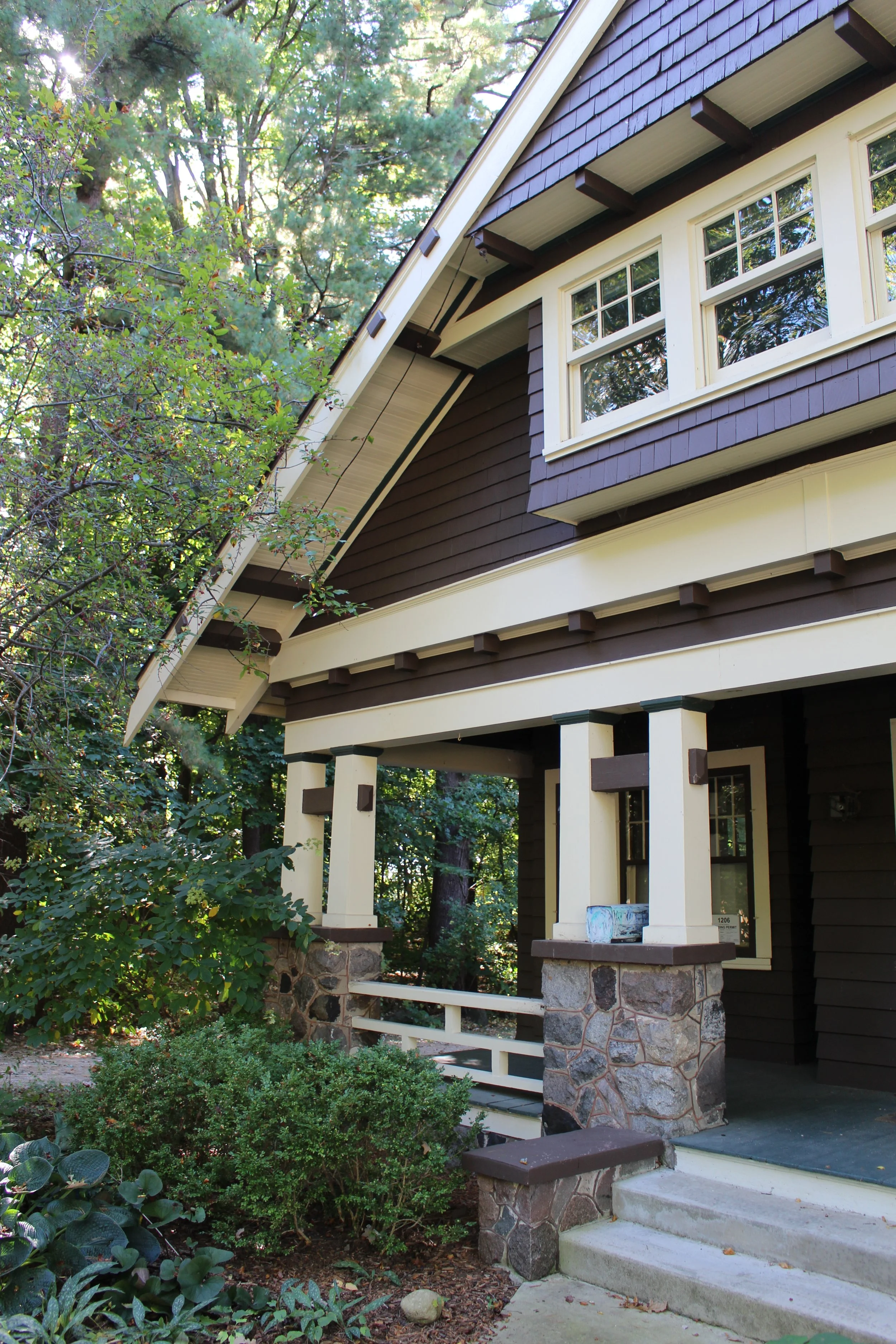 Tuttle’s house embodies the Craftsman spirit. The form and materials are straightforward. Clapboard siding covers the first story and the roof has exposed rafter tails. Double-hung windows—with multiple panes in the upper sash and single panes below—are mostly arranged in groups of two or three. Multicolored rocks form the chimney, foundation, and piers for the porch; reddish-brown mortar emphasizes the random arrangement of fieldstones. A broad porch stretches across the main façade under a second-story gable faced with shingles. Carpentry details amplify the Craftsman aesthetic. Simple brackets, blocks, and exposed purlins are found under overhangs and eaves. Doubled porch posts are joined by braces that hint of Asian influence, as do the open porch railing and the flared tip of the gable. The Journal of Historic Madison describes the interior: “The feeling of the house is extremely rustic and homey, with much woodwork, beamed ceiling, and fieldstone fireplace inside...” A large L-shape chamber combines the living and dining rooms, the kitchen is at the rear, and bedrooms are on the first and second floors. [d]