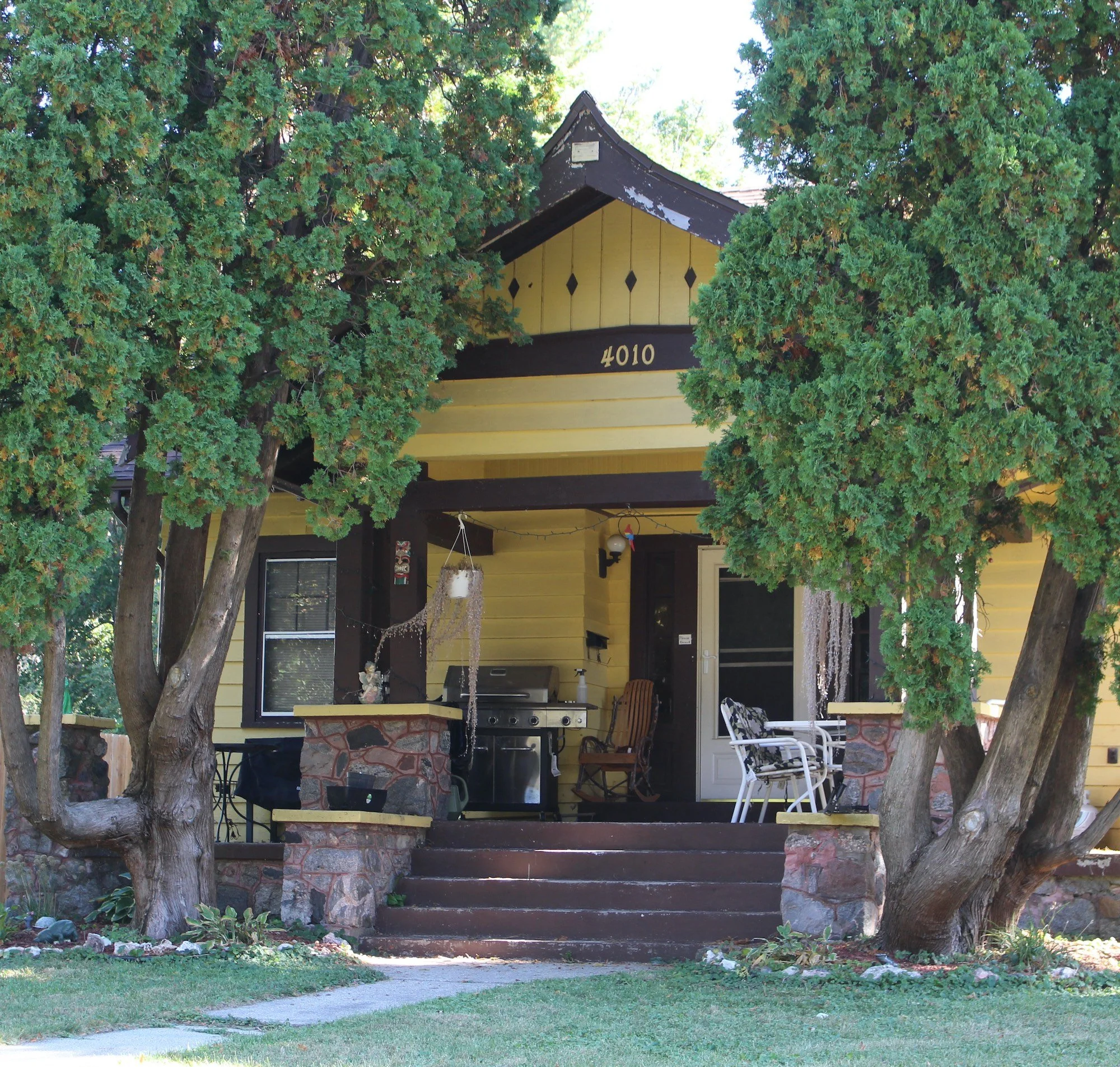 The third bungalow cluster has remnants of an ambitious development project at the east end of Lake Monona around present-day Lake Edge Park. Frank Hall was the principal investor in the Lake Edge Real Estate Company, Cora Tuttle was secretary, and Edgar C. Smith was sales manager. A handful of houses designed by Tuttle were built, but the subdivision didn’t take off; some have been demolished. The Thompson Bungalow (circa 1916) at 4010 Drexel Avenue shows her deft hand. The masonry on the porch piers is identical to the foundation work at the Tuttle House, though here the hefty posts are tripled and support exposed beams. The gable has a pagoda-like peak, as at the Cora Tuttle House.